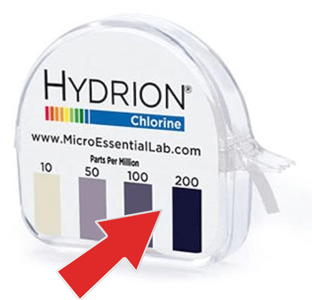 To verify that we have something that contains chlorine (good, healthy chlorine that doesn’t smell or bleach your hair), check your chlorine testing strips to see if your mixture contains chlorine matching the 200ppm (that’s parts per million) color: