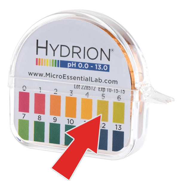 We want our pH strip (after dipping into our mixture) to be a 5, so close to this color on this particular brand of testing strip: